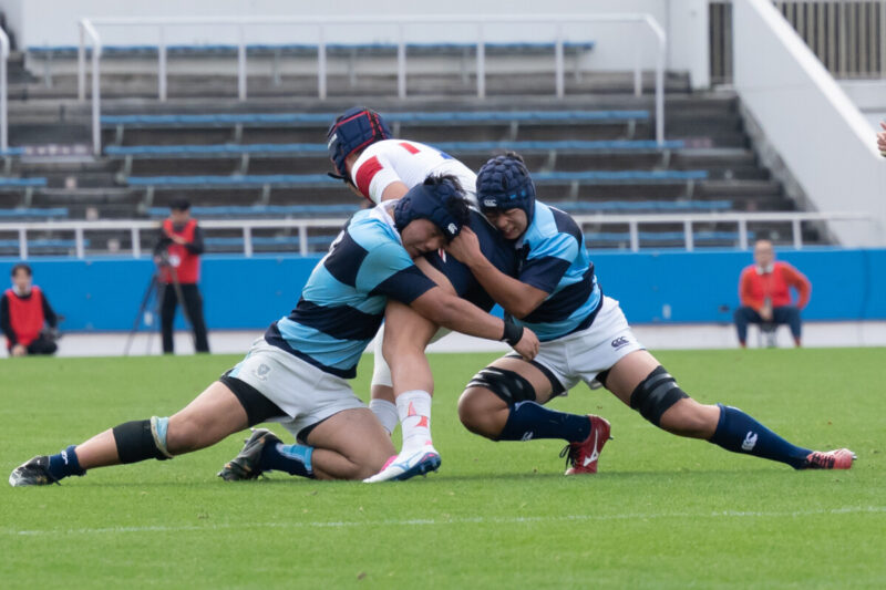 試合は、立ち上がりから相手の大きなフォワードに押し込まれ、先制点を許す苦しい展開となりました。その後、ペナルティーキック(3点)で反撃するものの、前半はミスの隙を突かれ3-26で折り返しました。