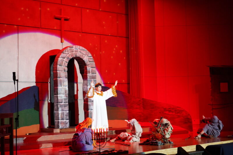 演出的には、少々ショッキングと言えばショッキングです。第4場「はじめてのクリスマス」でキリストの降誕の喜びがしとやかにやさしく温かい色の光で綴じられ、そして暗転、突然の「十字架の行進」。降誕を祝うクリスマスに同時に十字架上での死という使命を持ったキリスト・イエスをくっきりと描き出す脚本。ここが普通のクリスマス・ペイジェントではないところでしょう。