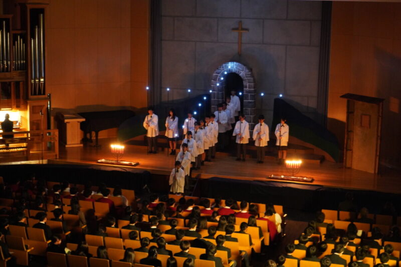 降誕劇、いわゆるクリスマス・ペイジェントは、イエスのキリストとしての誕生の意味を聖書に沿ってドラマ化したものです。生徒たちが、イエスの受胎を告げる天使、マリアとヨセフ、羊飼い、時の為政者ヘロデ王、そして東方の三博士などの役を演じます。