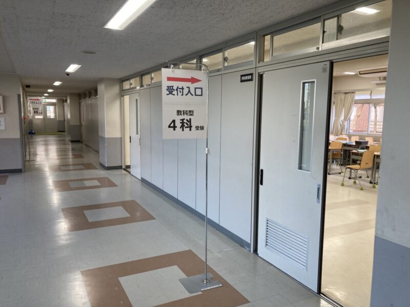 校舎1階の受付へお越しください。受験する教科数で受付教室が異なります。受付教室には保護者も一緒にお入りください。